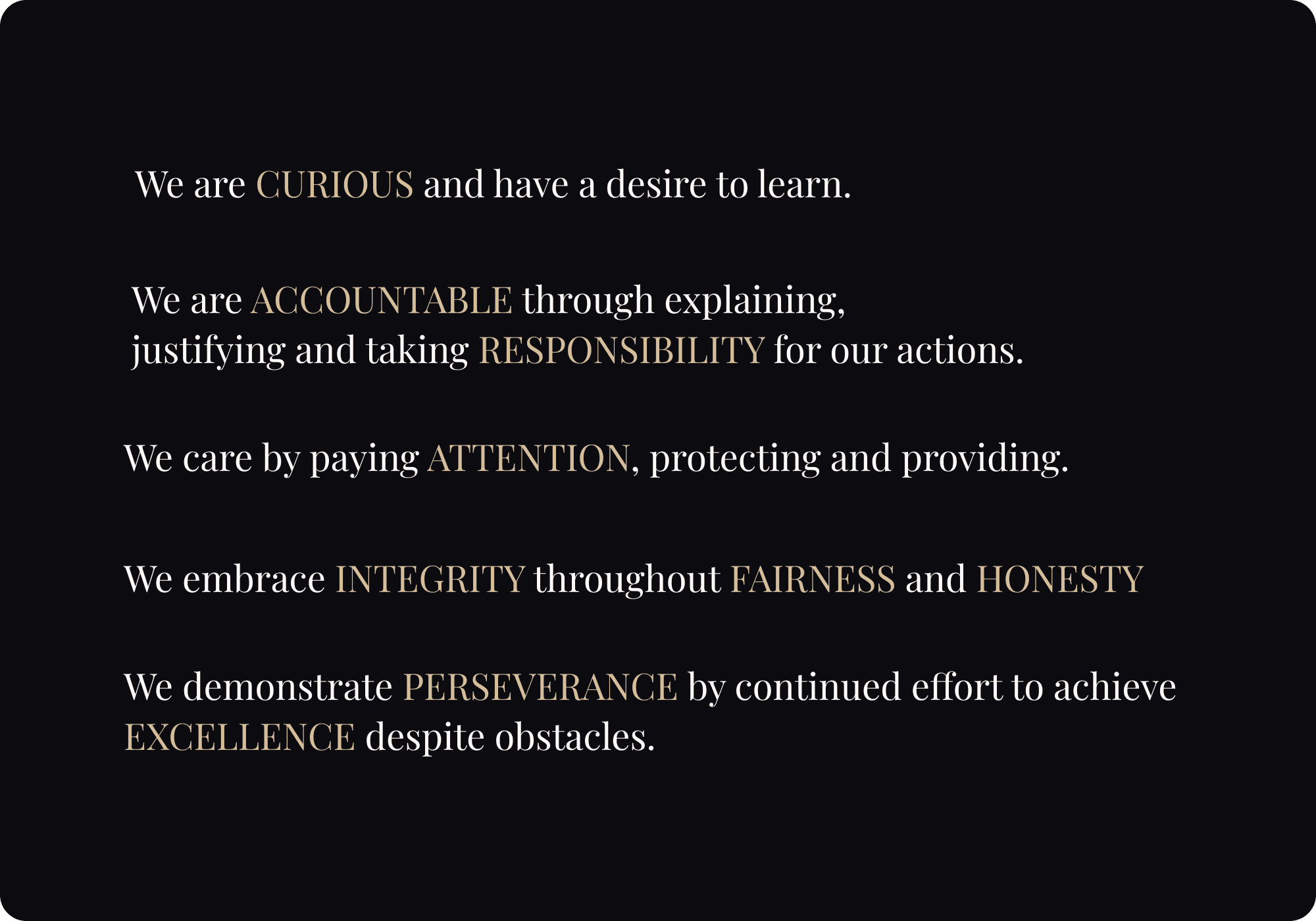 We care deeply for what we do, and guided by curiosity, accountability, and integrity, we will passionately continue our steadfast strive for excellence.